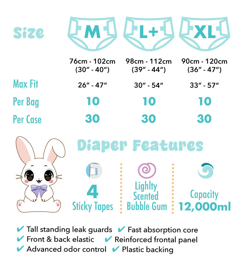 Meet Bunny Boo, one of our most absorbent briefs with a 12L capacity, perfect for nighttime wear and heavy incontinence. Featuring a printed frontal tape with an adorable bunny design and a light bubblegum scent, this sweet spring-inspired brief is made for those who love a touch of kawaii charm and all the cozy Easter vibes with its protection.